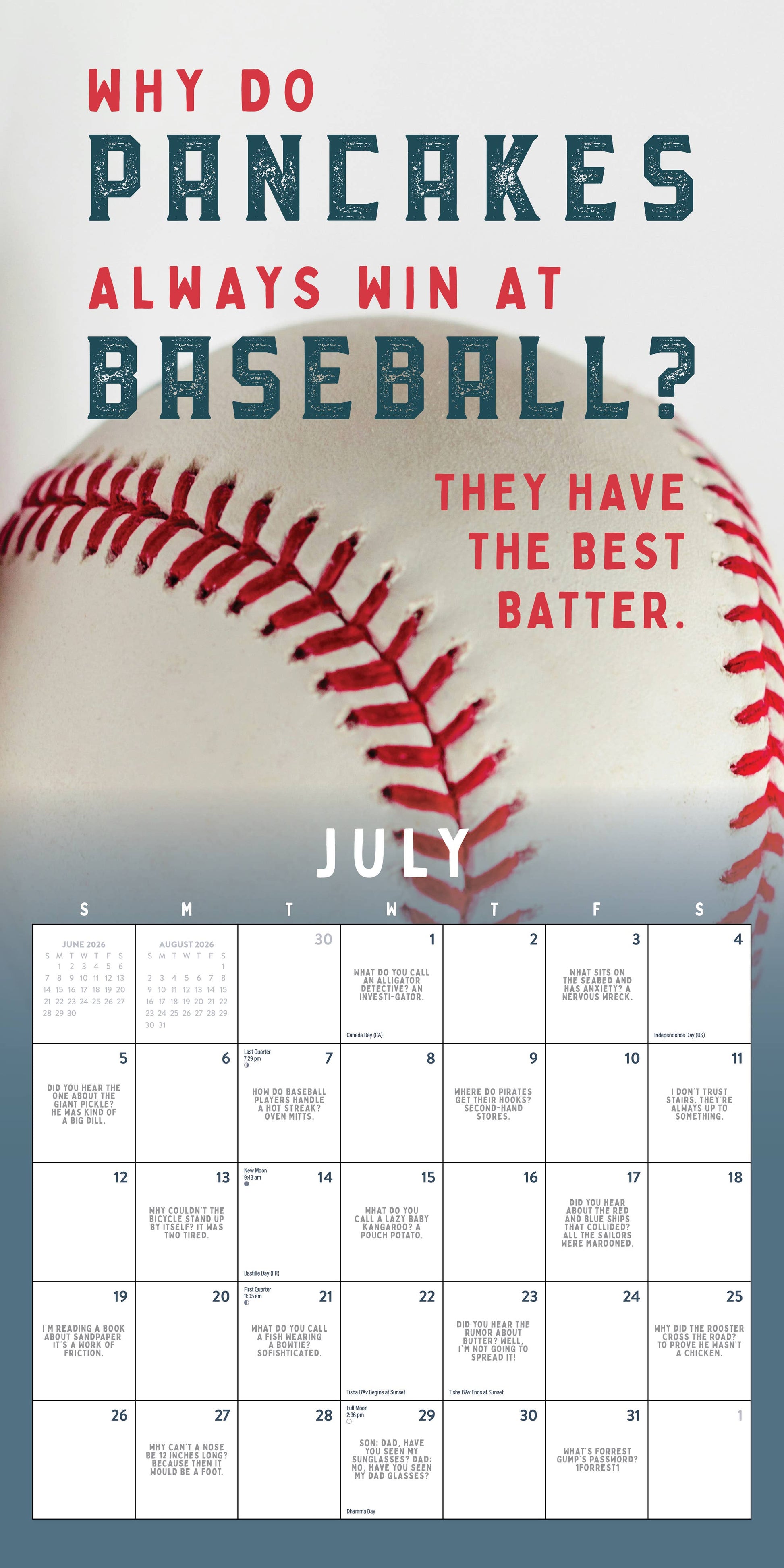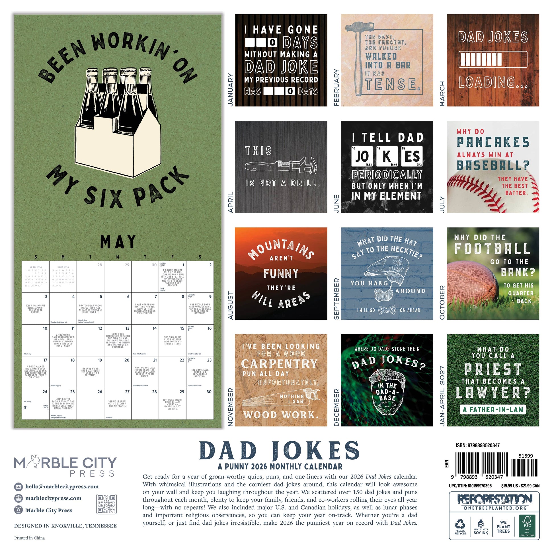 Dad Jokes 2026 Wall Calendar Marble City Press - Get ready for a year of groan-worthy quips, puns, and one-liners with our 2026 Dad Jokes calendar. With whimsical illustrations and the corniest dad jokes around, this calendar will look awesome on your wall and keep you laughing throughout the year. We scattered over 150 dad jokes and puns throughout each month, plenty to keep your family, friends, and co-workers rolling their eyes all year long—with no repeats! We also included major U.S. and Canadian holidays, as well as lunar phases and important religious observances, so you can keep your year on-track. Whether you’re a dad yourself, or just find dad jokes irresistible, make 2026 the punniest year on record with Dad Jokes.