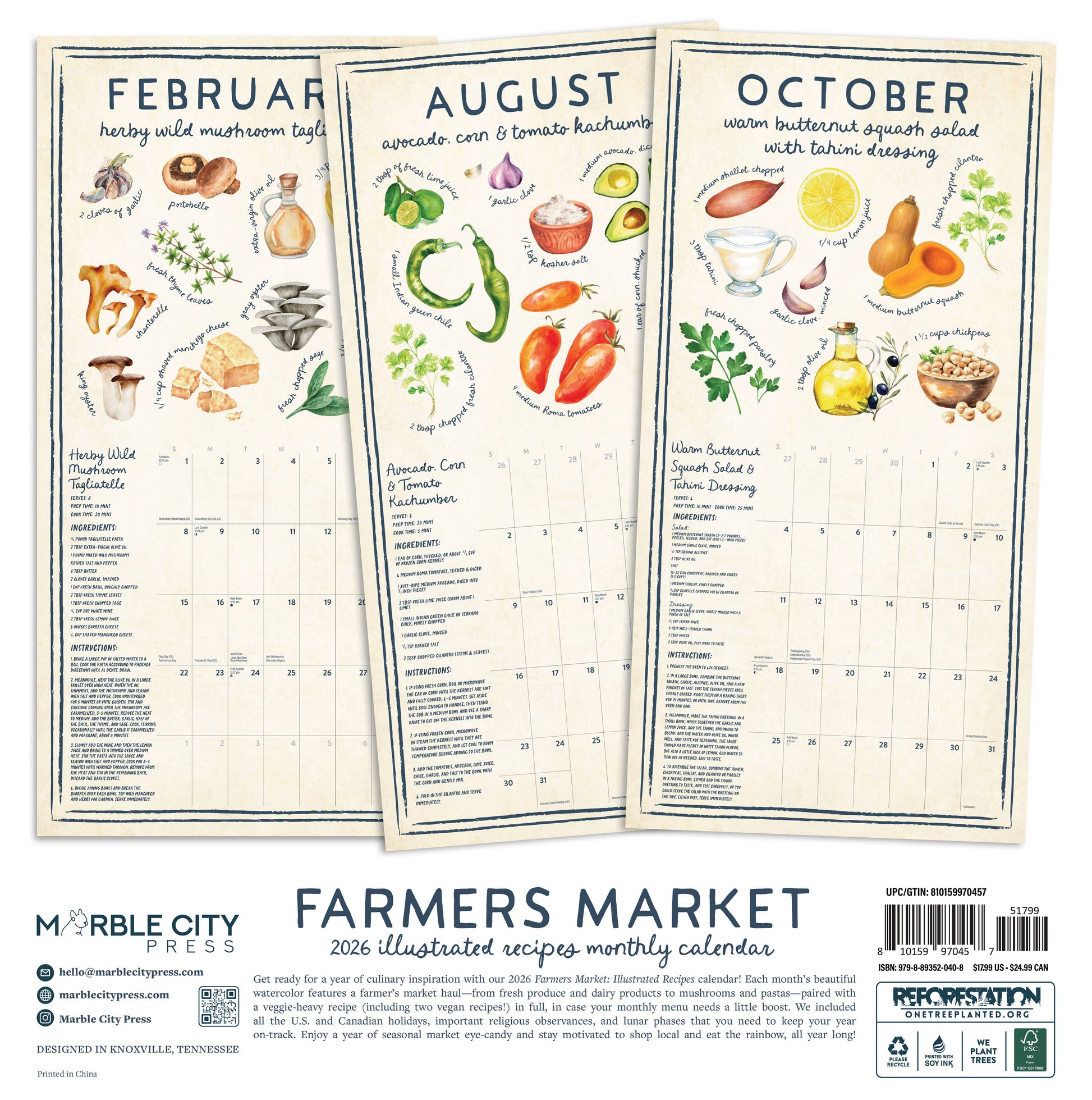 Farmer's Market Recipes 2026 Wall Calendar Marble City Press - Get ready for a year of culinary inspiration with our 2026 Farmers Market: Illustrated Recipes calendar! We hand-selected thirteen beautiful watercolors of seasonal market hauls—from fresh produce and dairy products to mushrooms and pastas—that will make an artistic statement on your wall, and inspire you to make a trip to your local market. We paired each image with a veggie-heavy recipe, included in full, in case your monthly menu also needs a little boost! We made sure to include all the U.S. and Canadian holidays, important religious observances, and lunar phases that you need to keep your year on-track. Enjoy a year of seasonal market eye-candy and stay motivated to shop local and eat the rainbow, all year long!