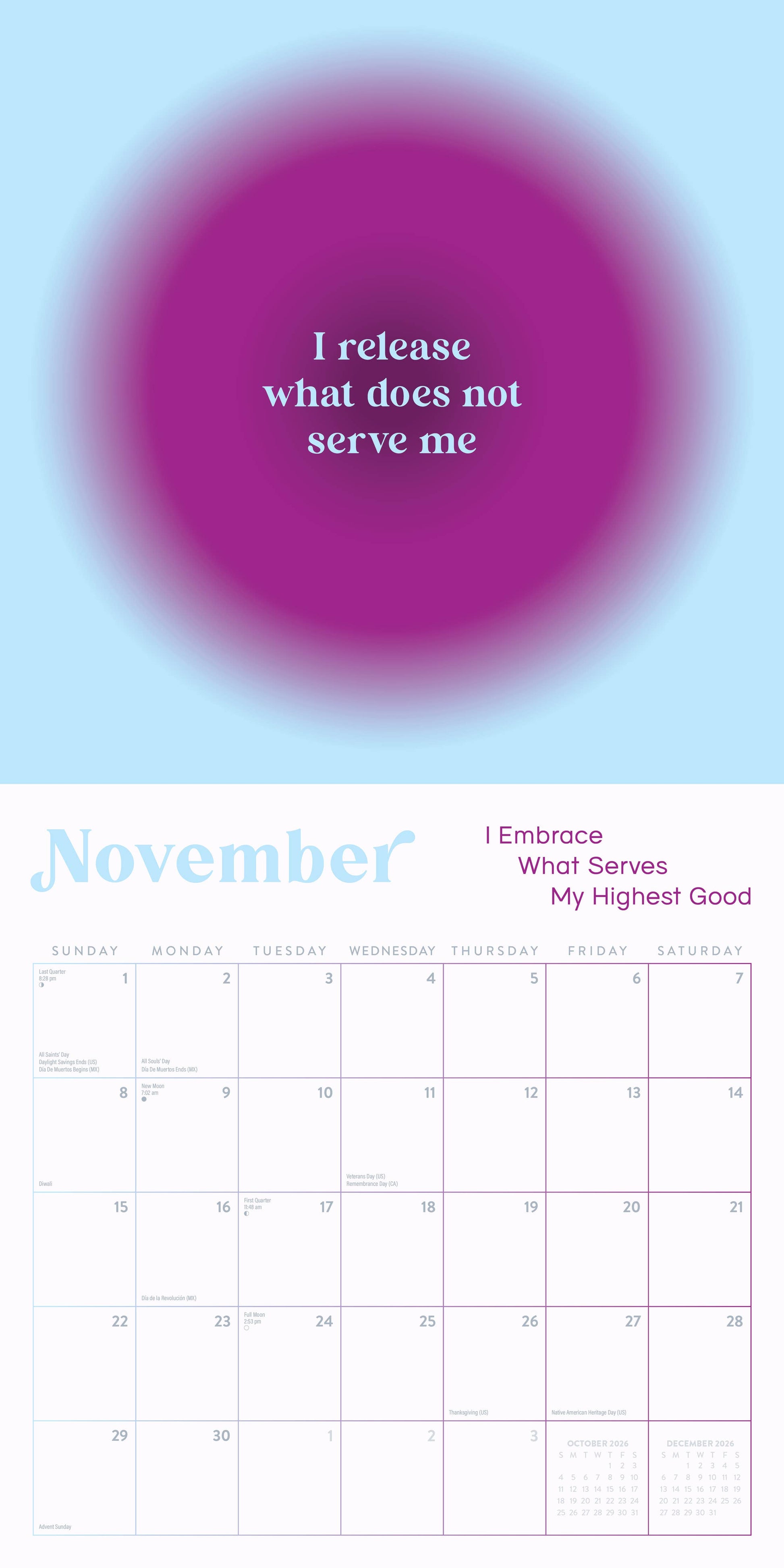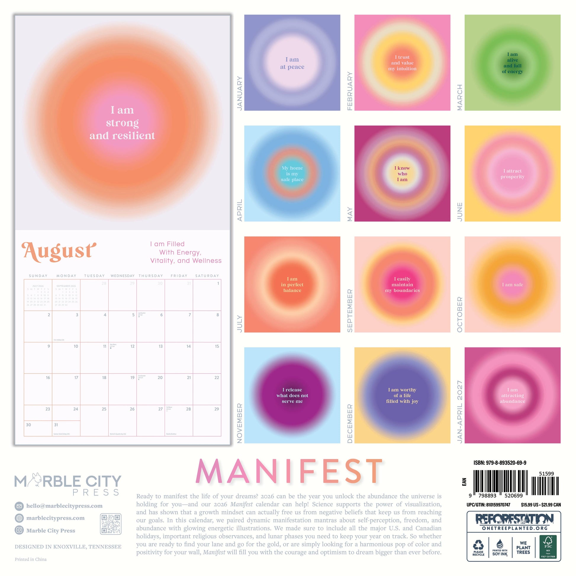 Manifestation 2026 Wall Calendar Marble City Press - Ready to manifest the life of your dreams? 2026 can be the year you unlock the abundance the universe is holding for you—and our 2026 Manifestation calendar can help! Science supports the power of visualization, and has shown that a growth mindset can actually free us from negative beliefs that keep us from reaching our goals. In this calendar, we paired dynamic manifestation mantras about self-perception, freedom, and abundance with glowing energetic illustrations. We made sure to include all the major U.S. and Canadian holidays, important religious observances, and lunar phases you need to keep your year on track. So whether you are ready to find your lane and go for the gold, or are simply looking for a harmonious pop of color and positivity for your wall, Manifestation will fill you with the courage and optimism to dream bigger than ever before.
