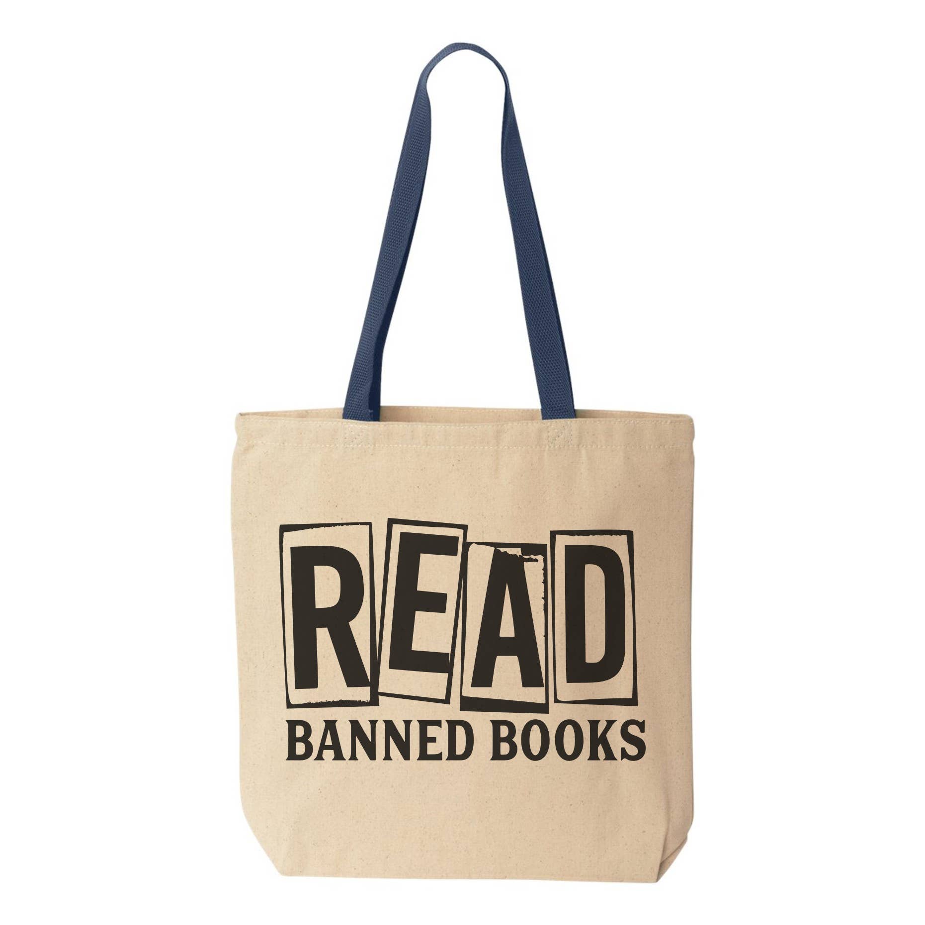 This tote was designed in our shop and measures a generous 14.5" wide and almost 15" tall. The book bag features a black design. The tote itself is Khaki/beige in color with offsetting black handles. There is also an option of a Navy blue handled bag.